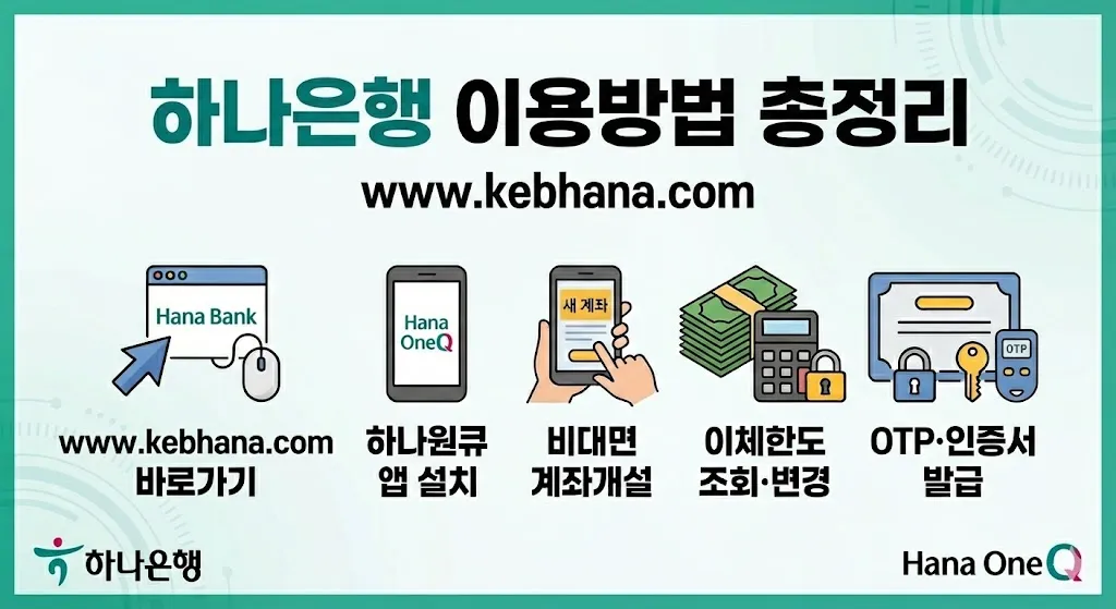 하나은행 인터넷뱅킹을 찾고 계신가요? 은행 방문 없이 계좌조회, 이체, 금융상품 가입까지 24시간 편리하게 이용할 수 있는 하나은행 온라인 금융 서비스를 소개합니다. 이 글에서는 하나은행 인터넷뱅킹 홈페이지 바로가기, 하나원큐 앱 비대면 계좌개설, 이체한도, 보안매체별 인증서 발급 방법까지 상세히 정리했습니다.